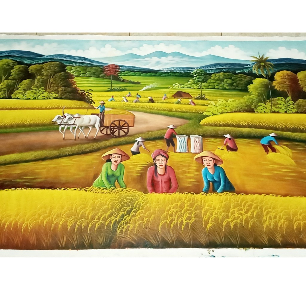 Repro digital custom size lukisan panen padi sawah bebek hoki kaya.